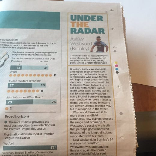 Brian got in touch with a letter about Westwood, flagging up a piece in the Times that Clarets club commentator Phil Bird tweeted about over the weekend:
